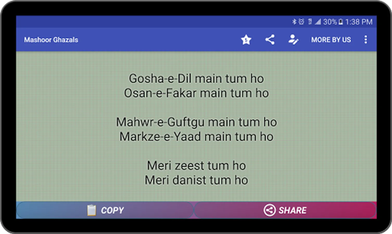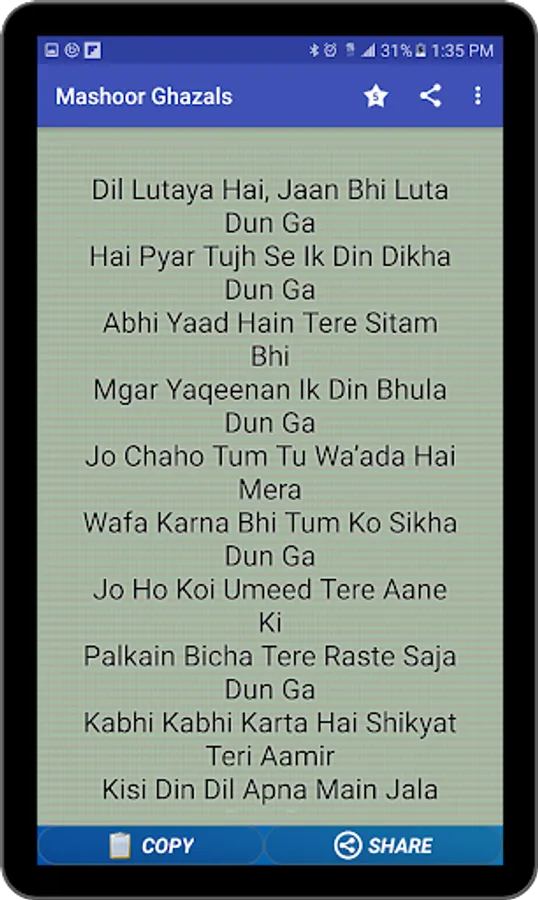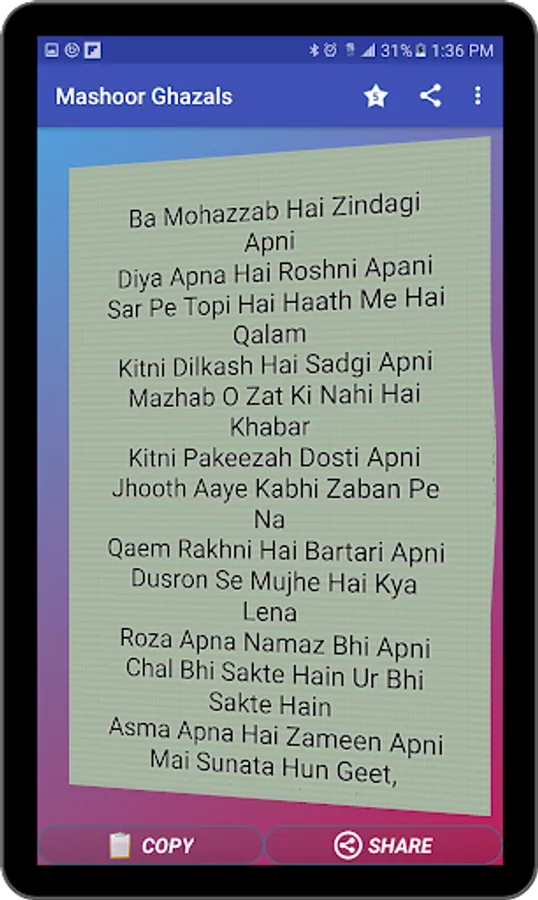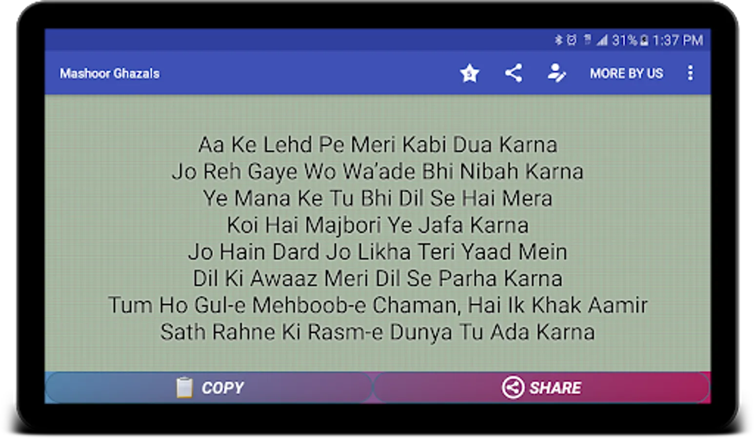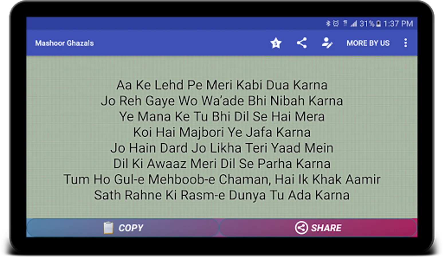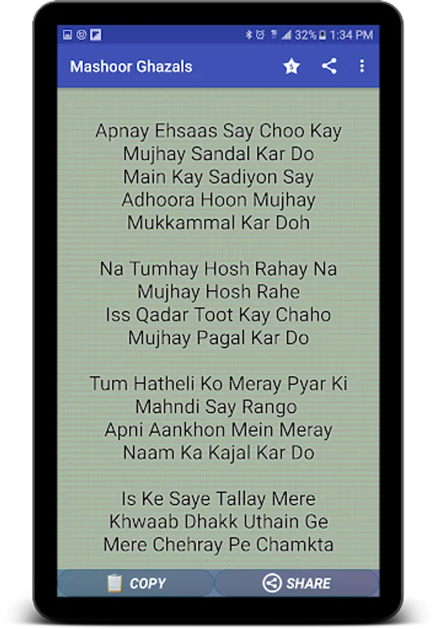 This app contain latest and heart touching ghazals مشہور غزلیں in urdu and hindi language. it icludes ghazals of mashoor poets like faraz, perveen shakir , wasi shah and many more. this is pp of sad, lov and dukhi shayari.