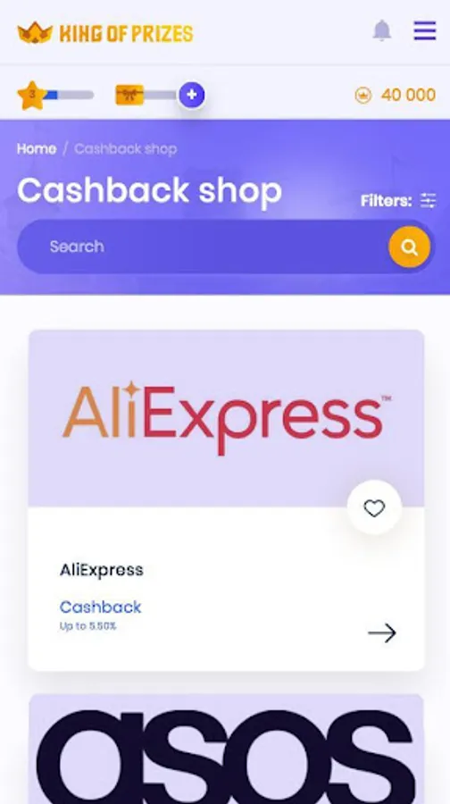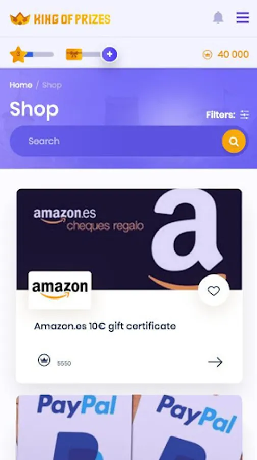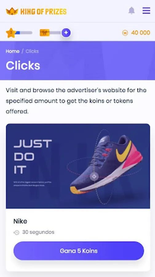 On King of Prizes we propose a wide range of surveys, advertisements, web registrations, app downloads or other promotions that will allow you to increase your balance (koins). Also take advantage of the discounts we give you, through which, we will refund you a percentage of the purchases you make (cashback, for now, only available in Spain). All these actions will help you to increase your balance of koins. Finally, you can redeem those koins that you have accumulated for gift vouchers for stores, games, money and many other prizes.