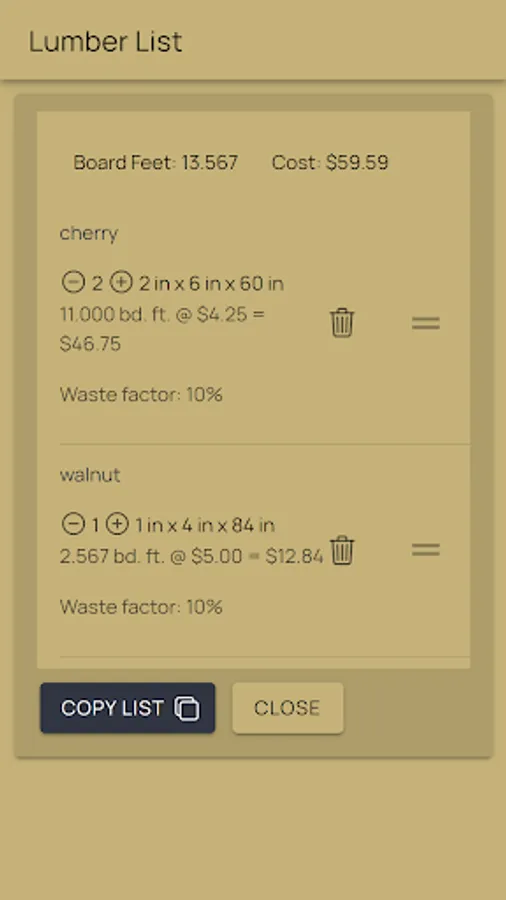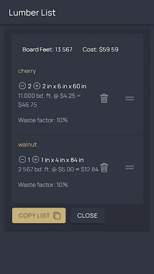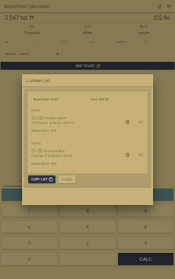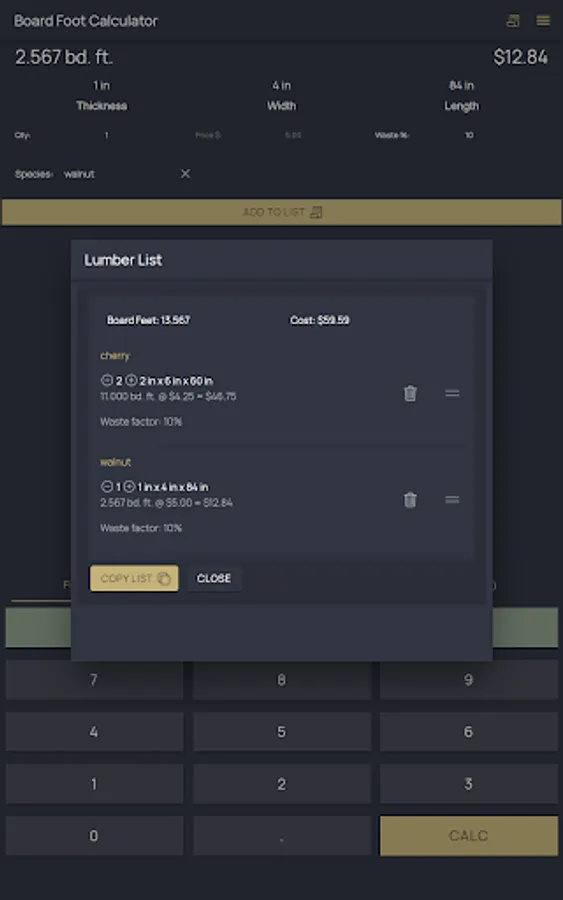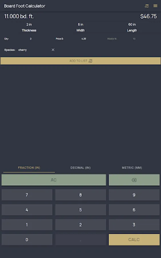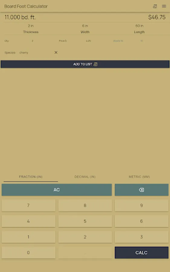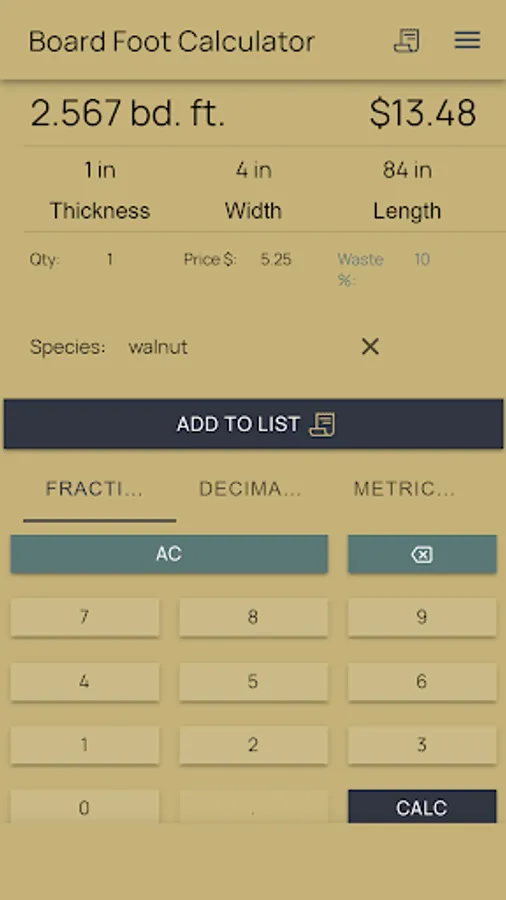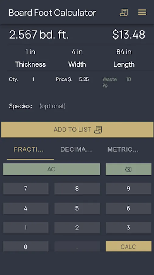 Optionally, you can enter a waste factor, species, quantity, and price to calculate the cost of the lumber.