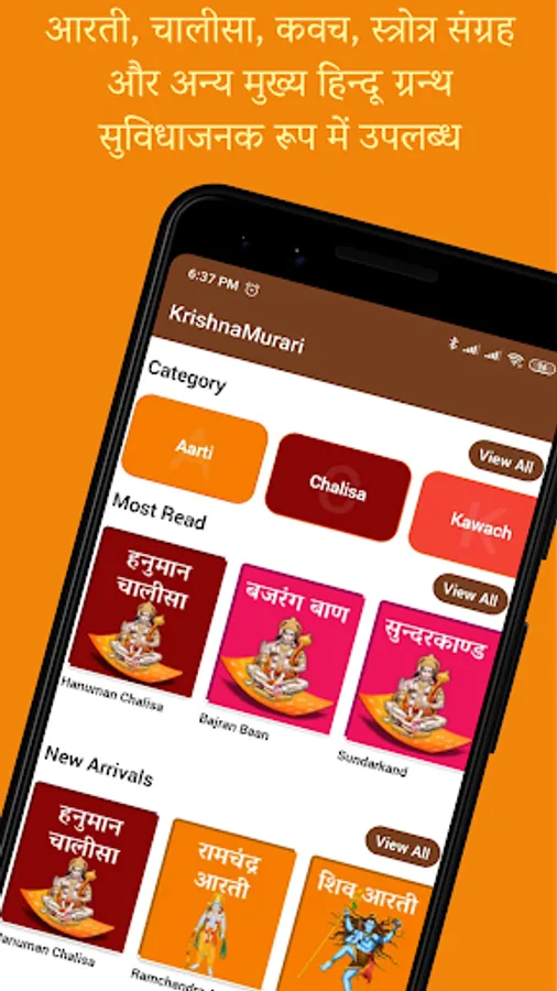 KrishnaMurari App is a complete collection of Aarti, Chalisa, Kawach, Stotra, Navratri Pujan and Vrat Katha in hindi lyrics eBooks. KrishnaMurari app is going to be a most complete collection of all hindu granth. App include other religious ebooks like Durga Saptashanti Hindi & Sanskrit, Sundarkand, Bajrang Baan, Sankatmochan Hanuman Ashtak etc. along with aartis, chalisas, kawachas and strotras of all hindu gods and goddesses. Durga Saptashati both in Hindi & Sanskrit is new edition to collection for Sharad or Shardiya Navratri (Navratras). We are determined to include Ramcharitmanas, Vrata Kathayen, Puran, Upanishads, Vedas and numerous other important hindu religious books / granthas in this app in our future updates for which work is already going on.