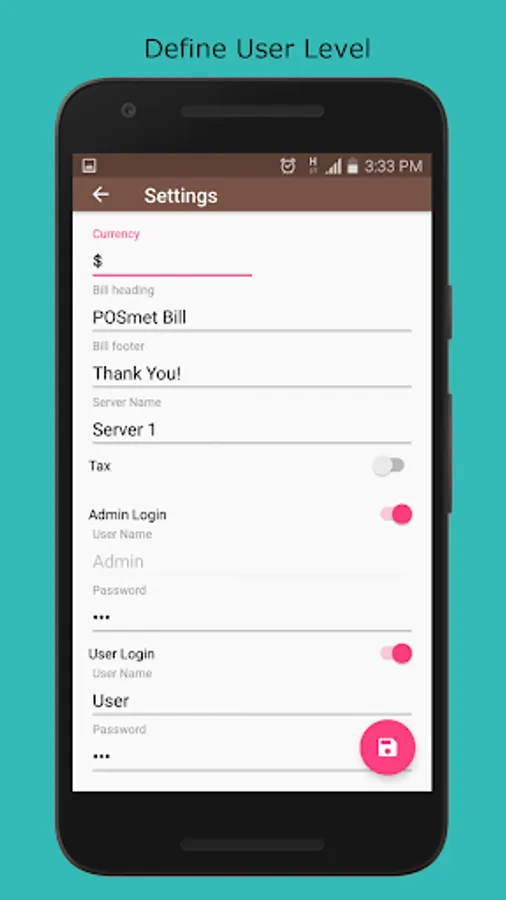 At Settings you can define the currency, user account, Tax, Business, User settings