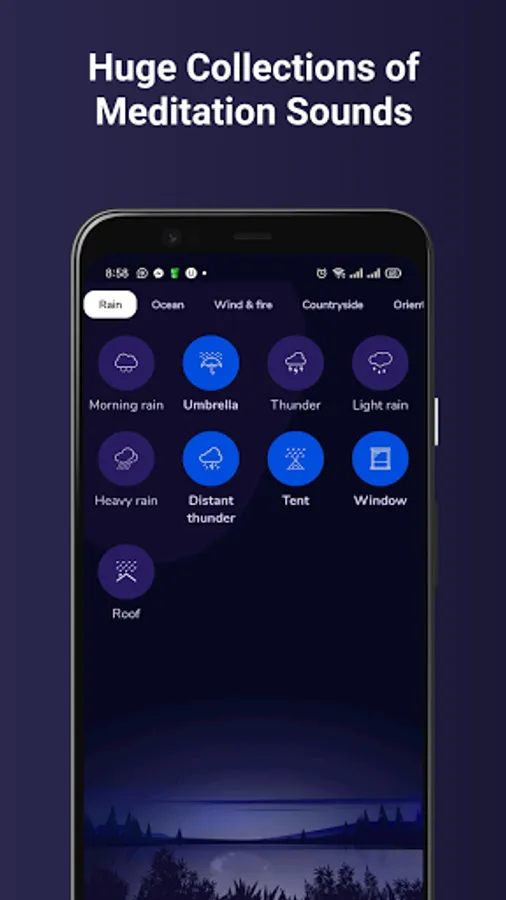 Rain: Morning Rain, Light Rain and in Tent sound, Rain in forest, Umbrella, Heavy rain, Window, Thunder, Distant thunder and Roof