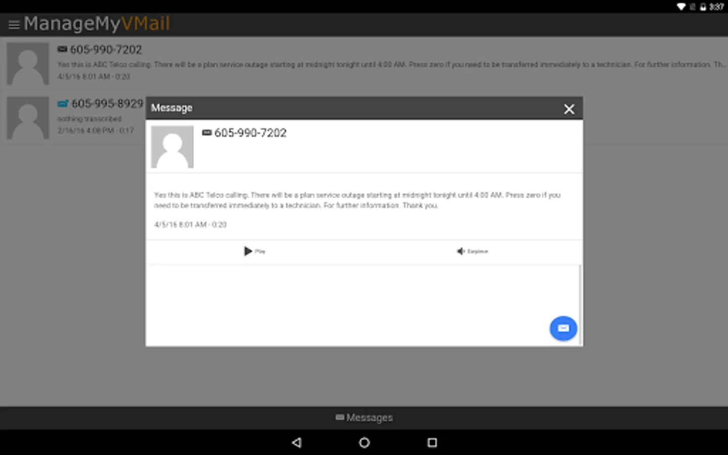 Access your voicemail from anywhere. With the ManageMyVMail app, you can connect to your voicemail inbox and retrieve your messages even when you are not at home. You will be able to listen to the voicemail from your mobile device or view the transcribed voicemail text.