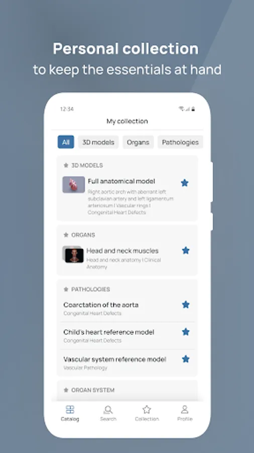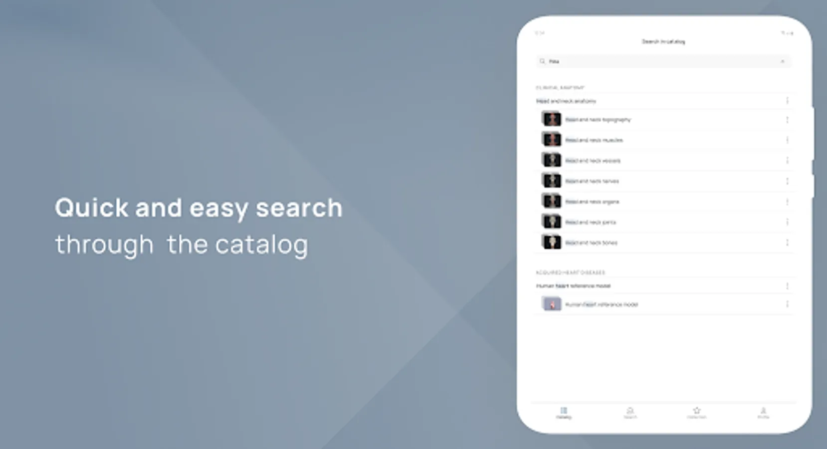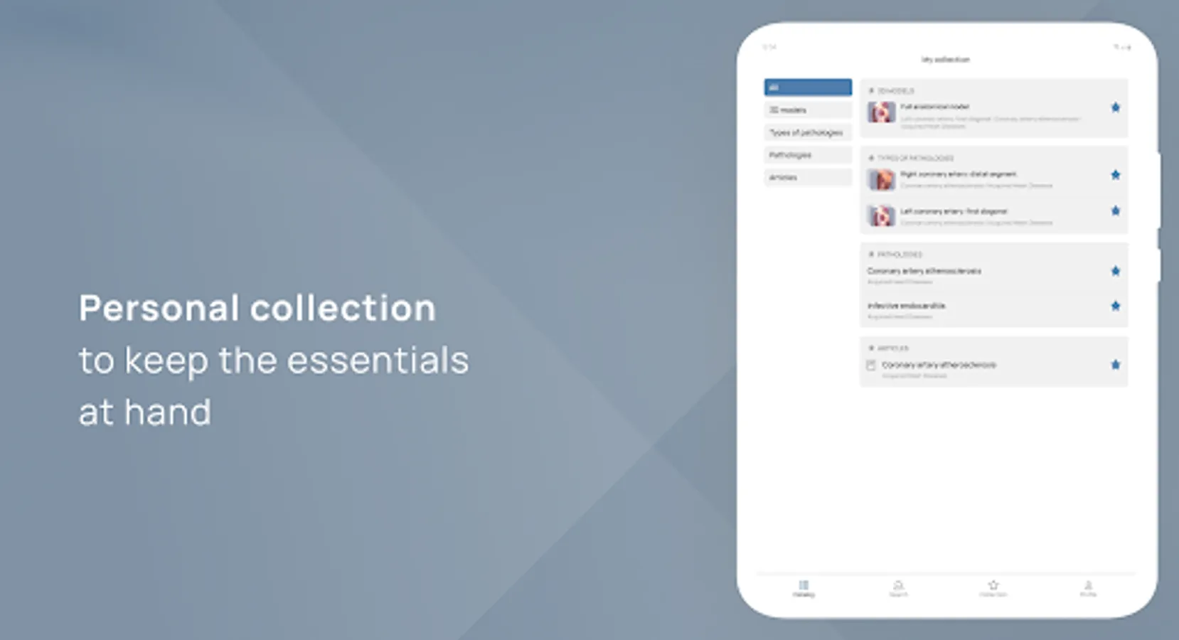 In the app, you will also find medical articles that describe the types and subtypes of pathologies from an anatomical point of view, clinical presentation, and treatment methods. Use them to prepare for classes or refresh your knowledge, save materials in your personal collections and share with mates.