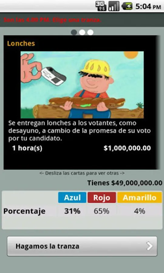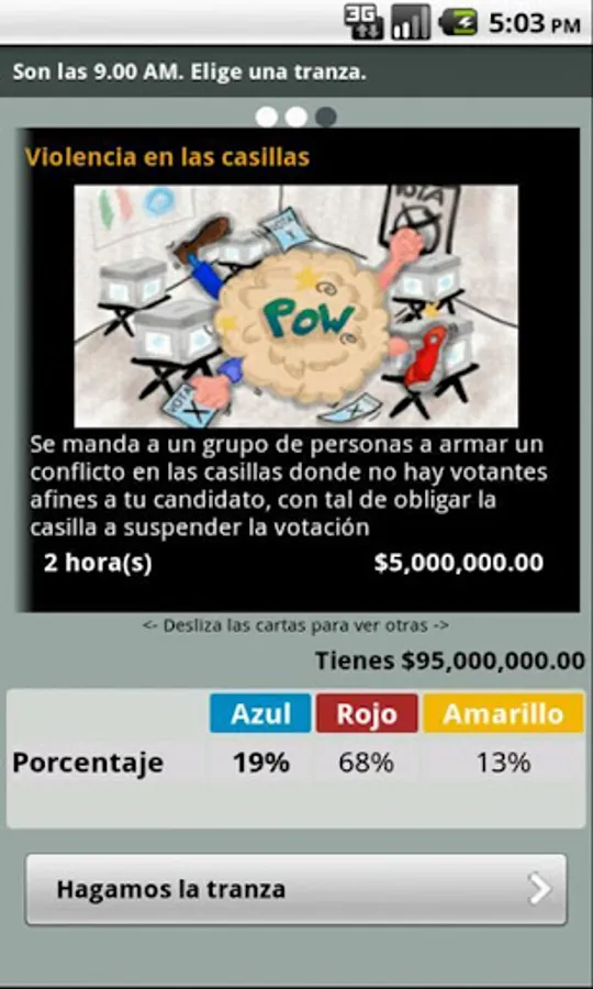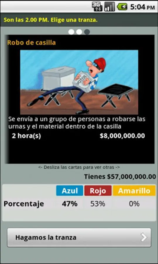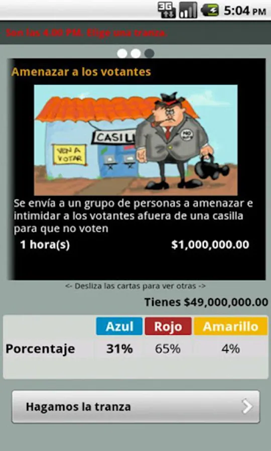 The game starts on election day when they open the boxes. You can choose from a collection of dirty tricks, each with a different cost and duration. Boxes close at 6pm so you should use your money and your time strategically to win. In addition, you must be lucky because random events can hit you at the polls.