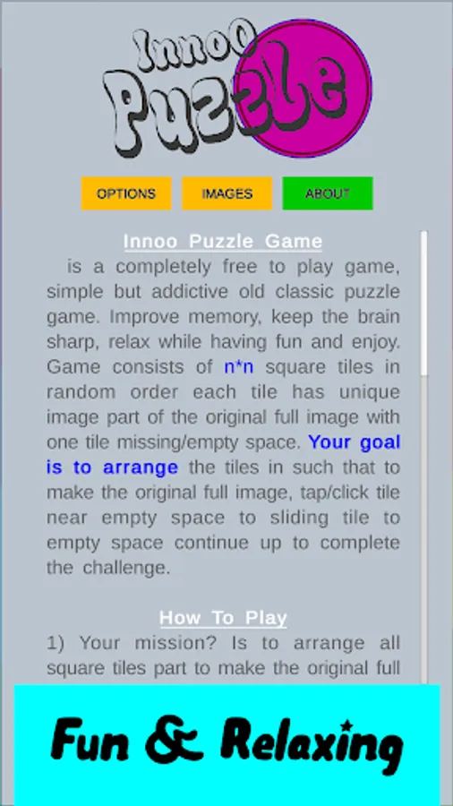 is a completely free to play game, simple but addictive old classic puzzle game. Improve memory, keep the brain sharp, relax while having fun and enjoy. Game consists of n*n square tiles in random order each tile has unique image part of the original full image with one tile missing/empty space. Your goal is to arrange the tiles in such that to make the original full image, tap/click tile near empty space to sliding tile to empty space continue up to complete the challenge.