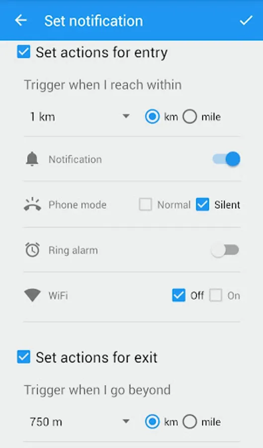 Set notifications for specific locations and automatically perform actions like Wi-Fi toggling, changing phone mode.