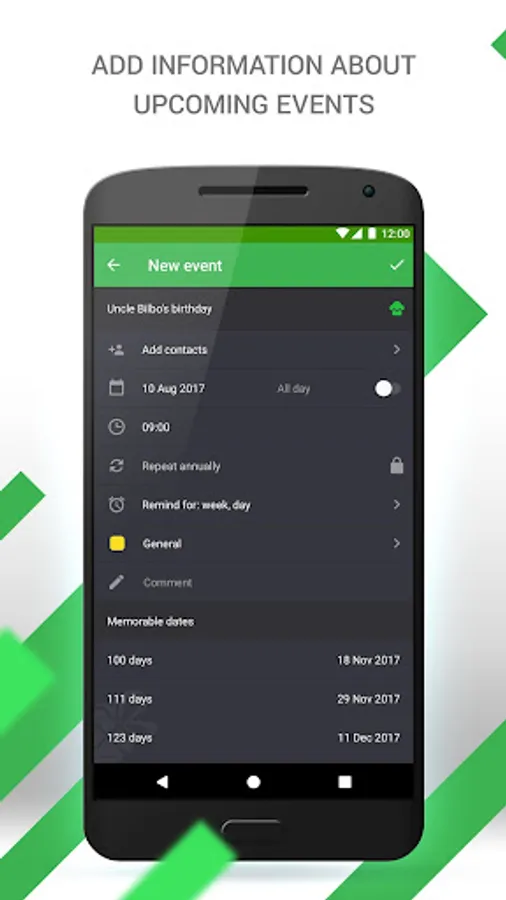 Add important events of your life, and the system will please you with a reminder of pleasant dates!