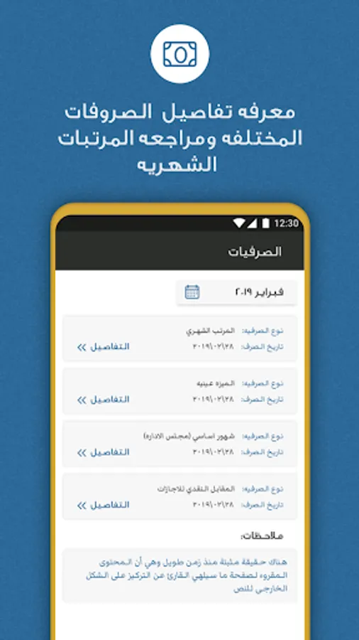 In this section; According to the company's payroll and salary system, employees can include salary details for a specific year / month, and they can usually view notes in salary details (unless they are included in users excluded from notes), and all details such as payments and / or deductions ... etc, And the salary account details, other payment details (if any) and his sukuk details.