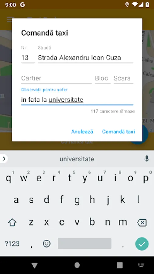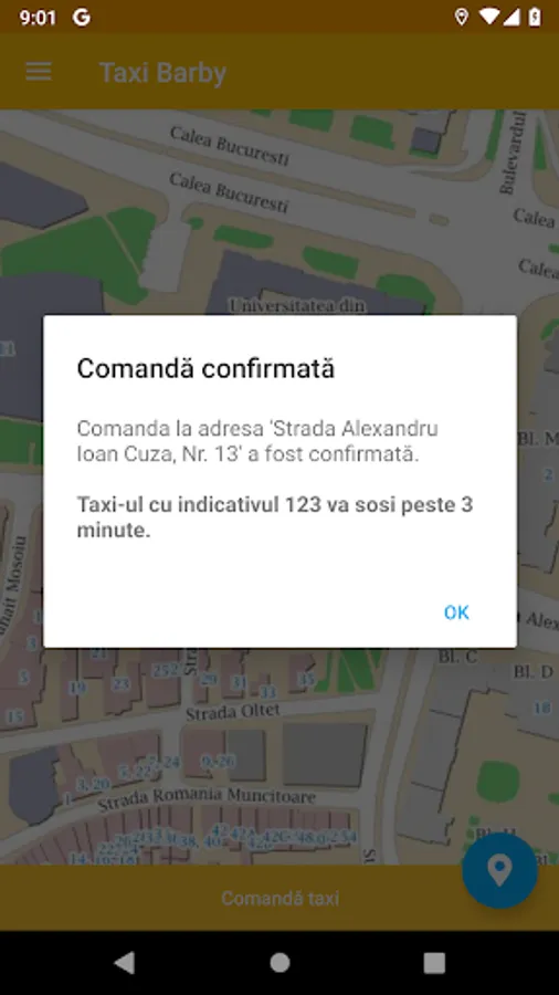 • The application automatically gets your location, and after you confirm the address, your order is sent to all available taxis.