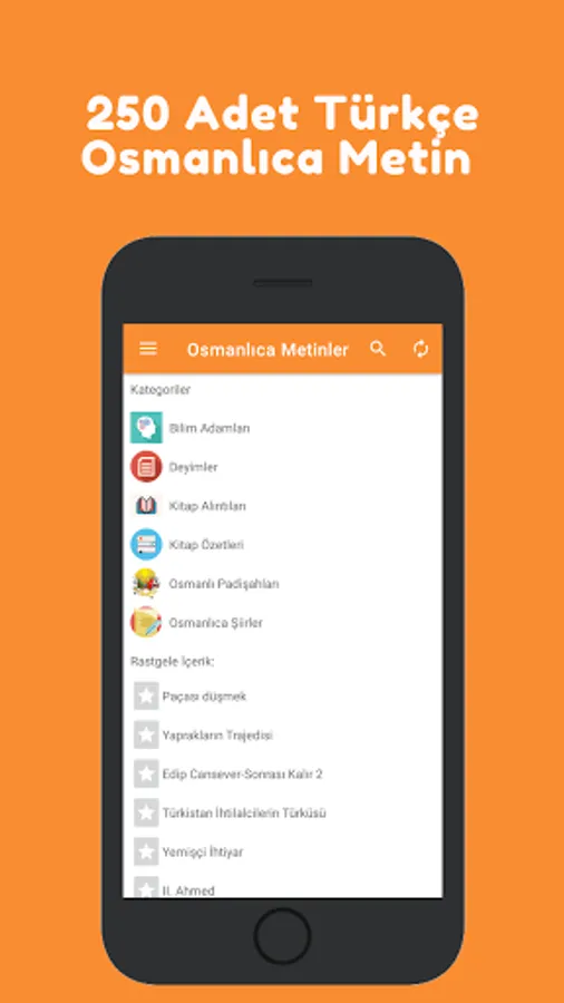 In our "Ottoman Texts" application, there are a total of 250 Ottoman Turkish texts, including 20 scholars, 40 book excerpts, 36 sultan's lives, 31 idioms, 22 book summaries and 101 poems.