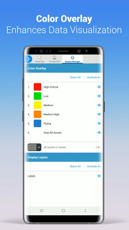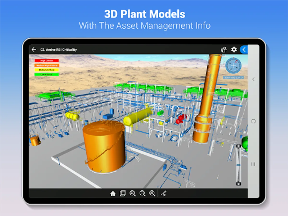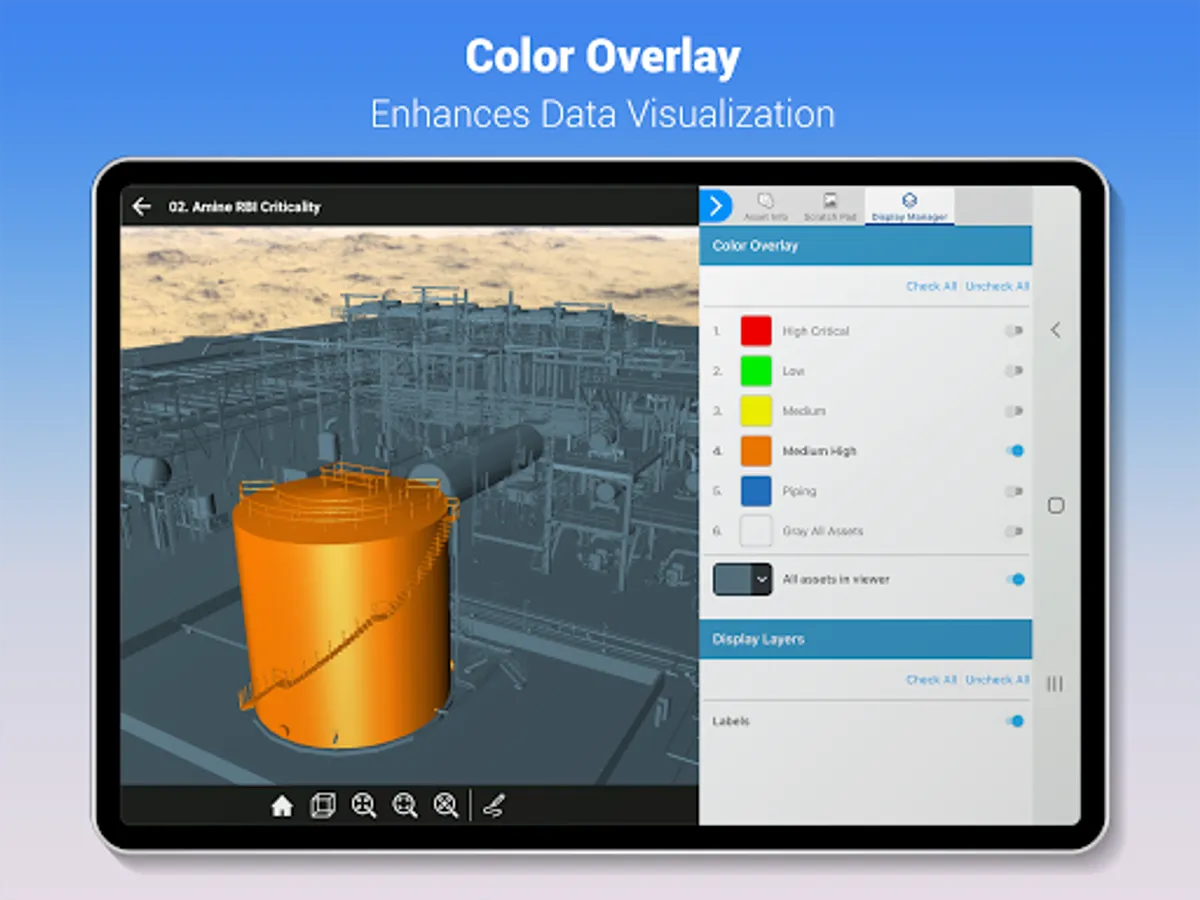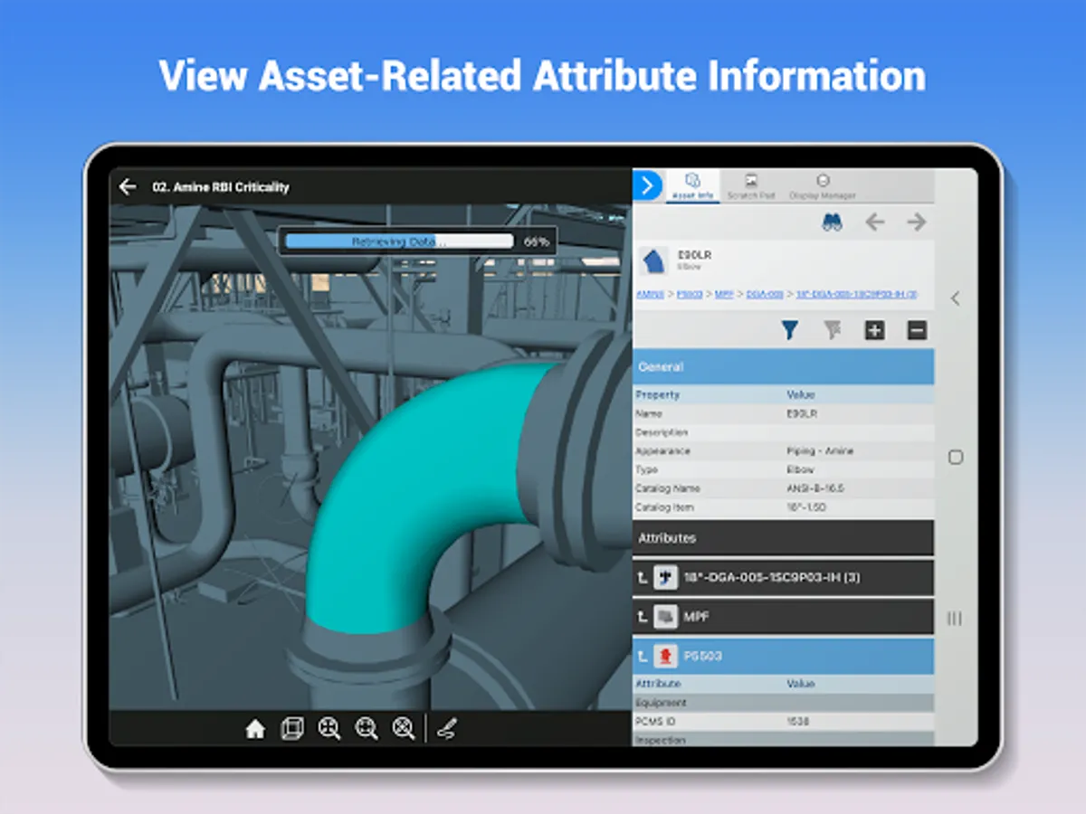 You can view asset related attribute information, including the information from systems of record, and the asset appearances can be changed to identify important operational information. You can manipulate the display in the 3D viewer to efficiently analyze the information.