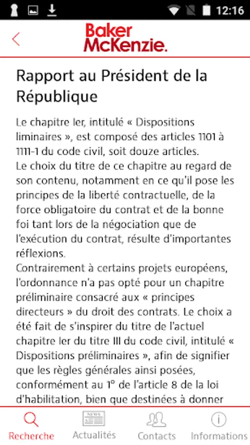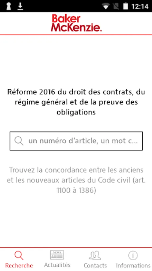 Baker McKenzie Réforme Contrats 2016 est une App gratuite, pour smartphone et tablette, développée par le Cabinet d’avocats Baker McKenzie pour ses clients et amis à l’occasion de la mise en œuvre de l’Ordonnance n° 2016-131 du 10 février 2016 « portant réforme du droit des contrats, du régime général et de la preuve des obligations » (« l’Ordonnance »).