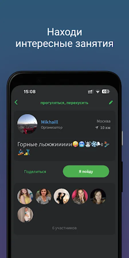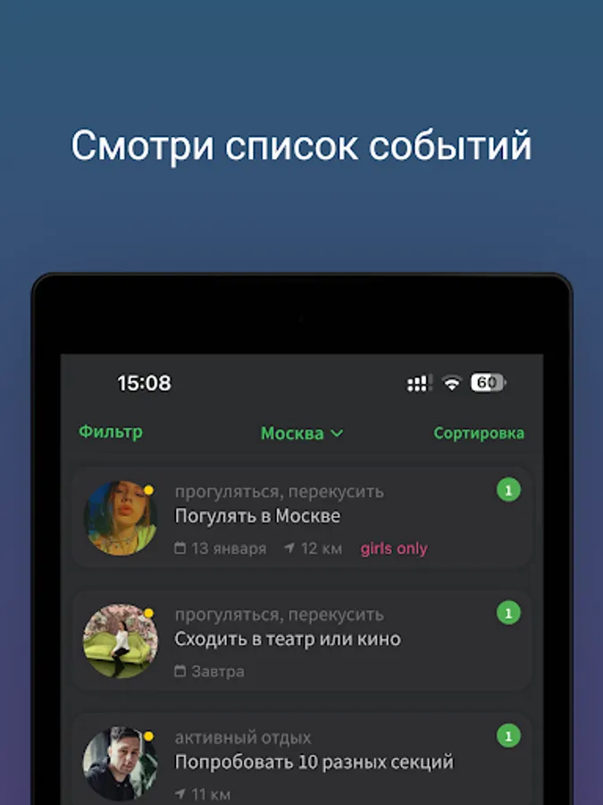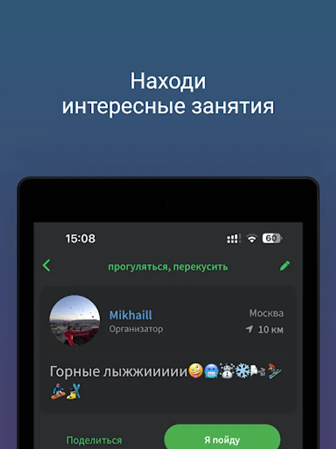 It's a new social network that allows users to add events, for example, to go for a walk, go to a concert, meet in a bar or cafe, watch a movie, play board games and so on. Let's make friends together!