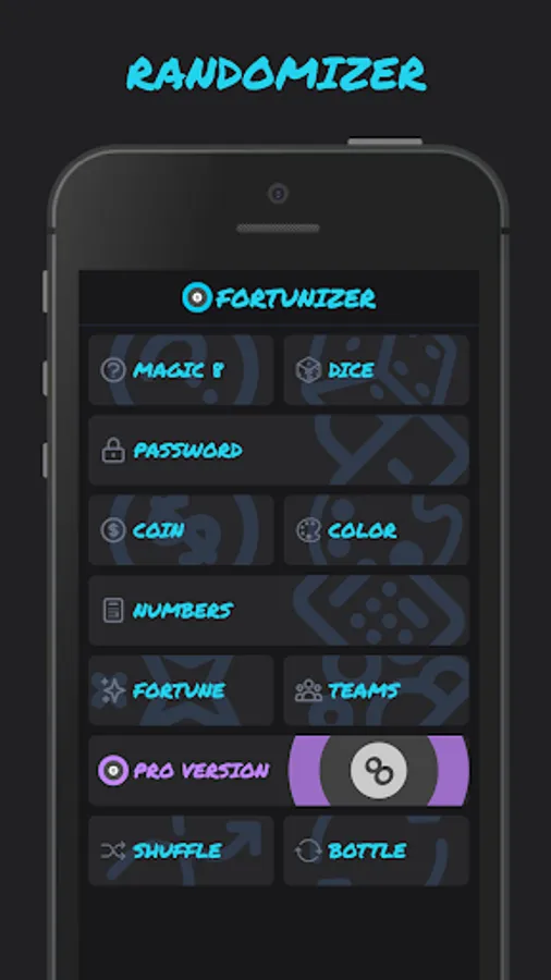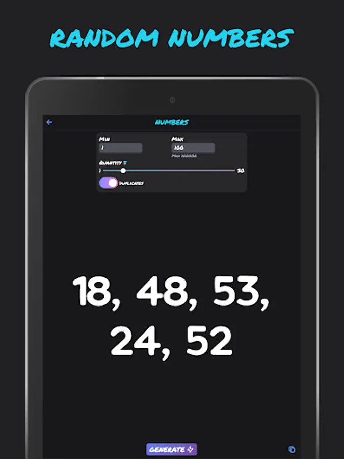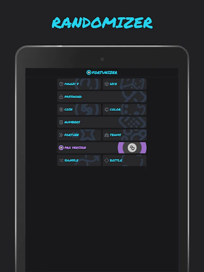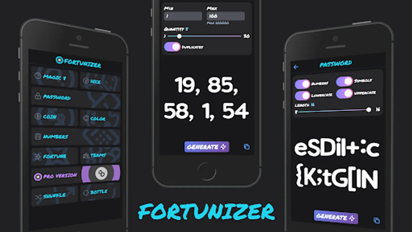 With this app, it's easy to generate a random sequence of numbers or choose one from a range. It's easy to create a randomly complex password to protect your accounts with just one button. If you need to randomly select one value from the list, the wheel of fortune will help, you can create up to 5 lists as you like and customize each one individually. There is a separate section for shuffling list items. The team generator is also indispensable for team games - a draw, create a list and break it into teams by the number of participants or by the required number of teams, the application's functionality can do both. And the magic 8 ball, straight from the movie "Interstate 60", will answer any question where the answer is "Yes" or "No".