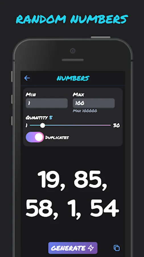 ✨ Random number generator. Range from 1 to 100,000, generating up to 30 numbers at the same time