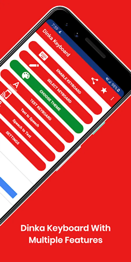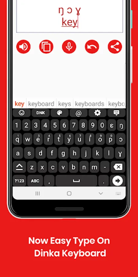 Dinka Keyboard by Infra will allow you to type in your own native Dinka ( Thuɔŋjäŋ , Nilo-Saharan ) Language and also in English text with the most attractive emojis