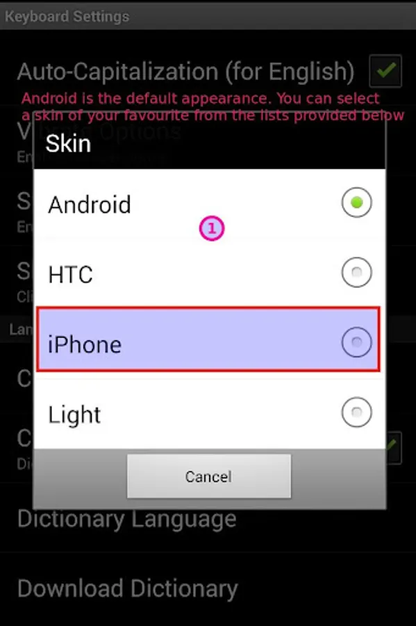 • Skin: This will enable you to change the appearance of your keyboard (For example, you can choose appearances of Android, iPhone, HTC and Light).