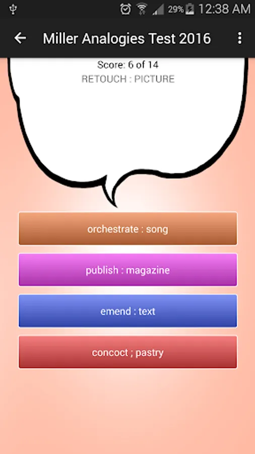 A straightforward app that helps you prepare for the Miller Analogies Test. Clean and super intuitive user interface design. Focus on studying, not on how to use an app. No internet connection required. No need to carry heavy books or to print bulky note cards.