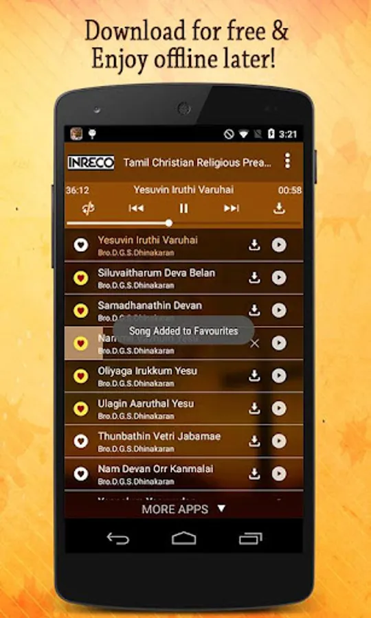 Christian Religious preachings in Tamil. Connect to the Almighty by the preachings.Brought to you by Inreco and Winjit Technologies, this app helps you listen to the best Christian preachings in Tamil. Enjoy the blissful collection on 2G/3G and Wifi as well. So, download this App now and feel the presence of all pervading divinity always around you.