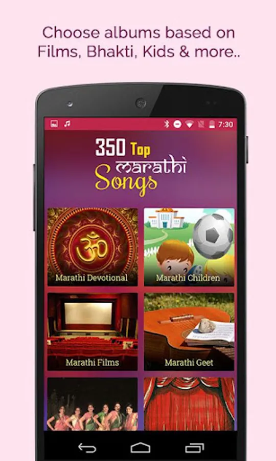Marathi Songs app is the one stop solution for all your Latest Marathi Music needs. Marathi Songs app offers you free, unlimited access to all your favorite top Songs, Latest Marathi Music on your mobile phone, no matter where you are.Marathi fans should not miss. App consist of Songs sung by various artists like Alakananda Wadekar, Shakuntala, Pushpa Pagdhare, Sharmila Datar, Usha Mangeshkar, Aparna Mayekar, Anuradha Padawal, Sobha Joshi, Sudhir Fadke and many more.