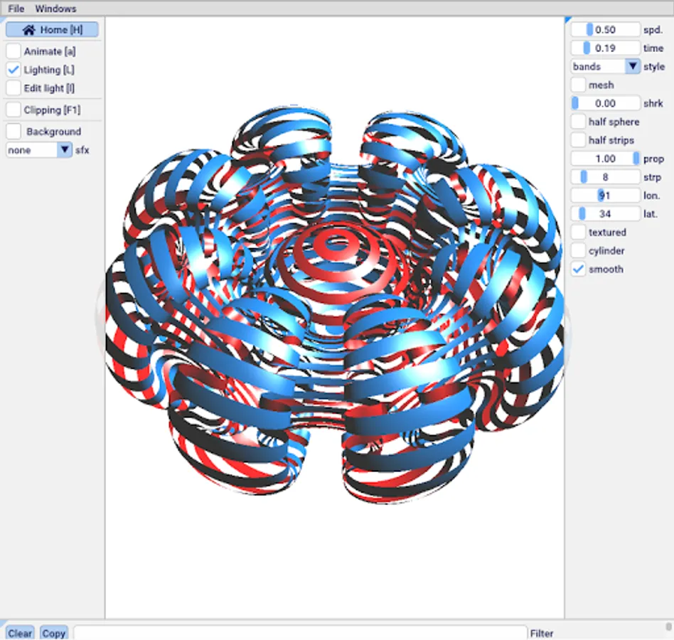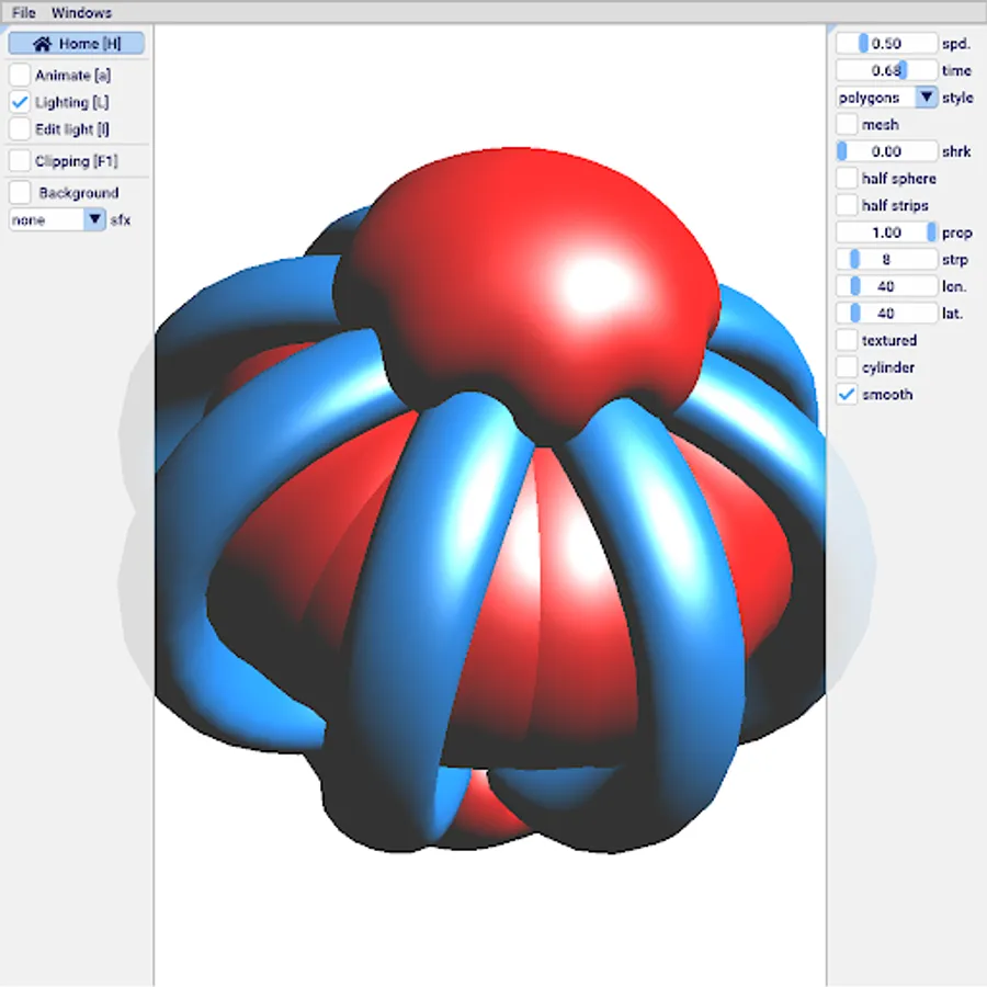 Sphere Eversion is a mathematical puzzle: how to turn a sphere inside-out without poking holes / shearing / tearing / pinching the surface ? This program shows a mathematical solution, based on the original program by Nathaniel Thurston and Michael Mc Guffin.