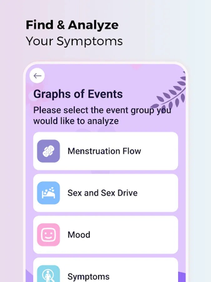 • Organize your menstrual cycle into a planner-like chart with graphs, color-coded days and light blue phases