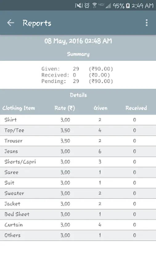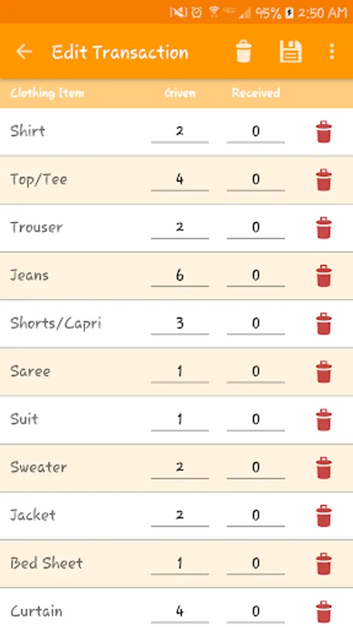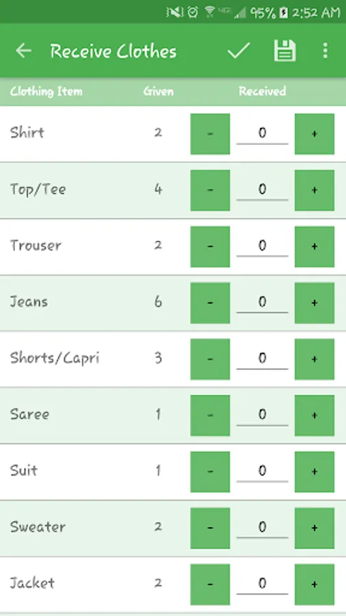 - Enter the quantities of each type of clothes given to your laundry person
