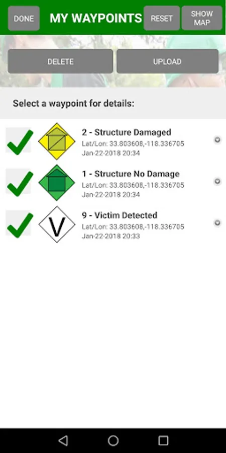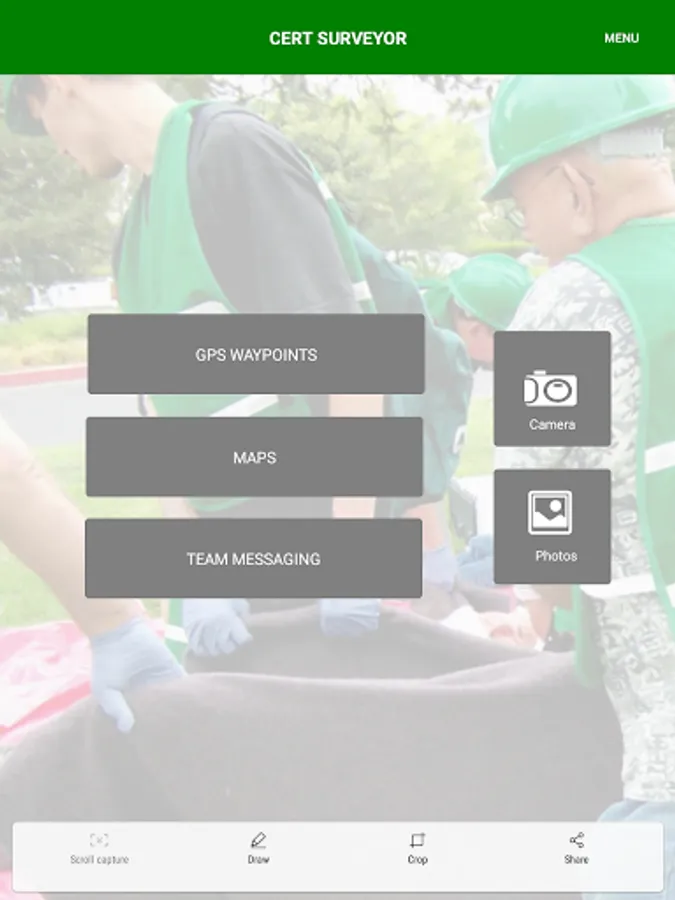 CERT Surveyor is designed by and for community emergency first responders for collecting information to help coordinate search and rescue operations. The app uses standard FEMA CERT icons for dropping waypoints on a map, allows creating tracks at variable intervals and distance deltas, and loads pdfs maps as well as create live maps with waypoint icons. All data can be uploaded to the accompanying website account and for data download as KML or GPX file formats for importing into ArcviewGIS and other GIS mapping platforms.