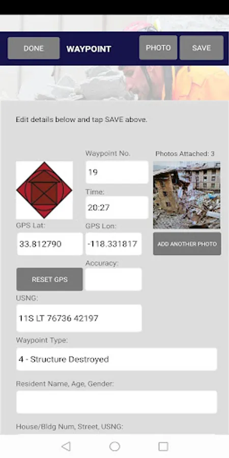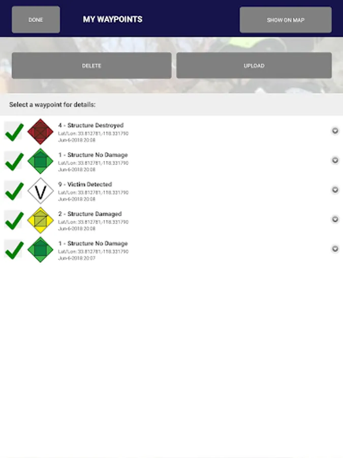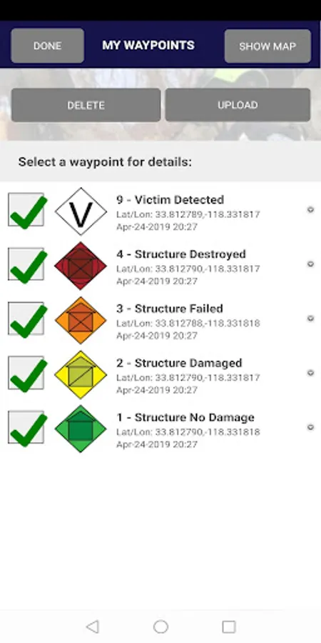 U.S. Disaster Surveyor is designed by and for domestic first responders for collecting information to coordinate urban search and rescue operations. Using standard FEMA waypoint iconography with the ability to attach photos and detailed "follow up" fields, USNG coordinates, as well as simple team messaging, maps and more, the app and accompanying website gives any team or group the ability to gain situational awareness for disaster recovery and rescue efforts. All information uploaded to the website can be exported to Excel, KML, and GPX formats for import into ArcviewGIS or other mapping systems. Disaster Surveyor provides a complete solution to your emergency team coordination needs.