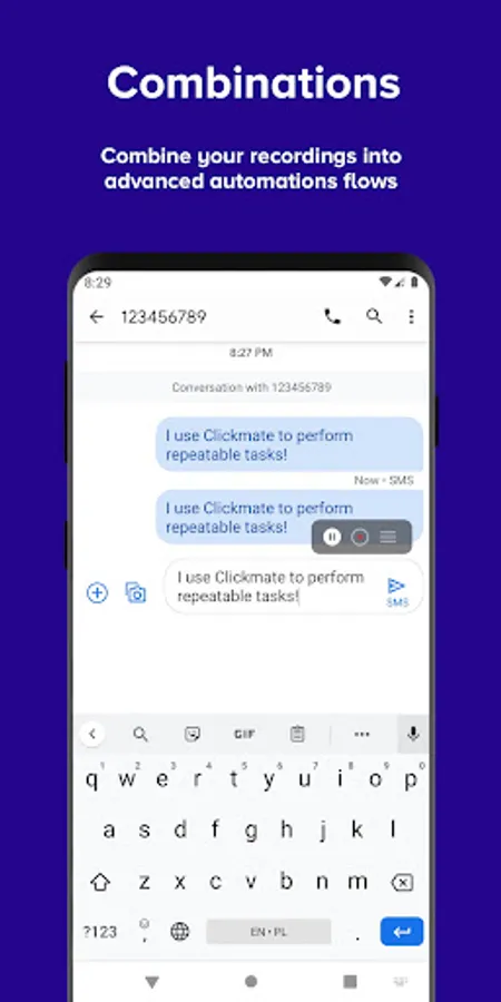• Record mode: Record and reproduce your touch input as well as system actions like back, menu button, apps button, taking screenshot (available on Android 9 and newer) using built-in navigation bar. Recorded tasks can be easily repeated as many times as you want. What is most important - this mode does not require root!