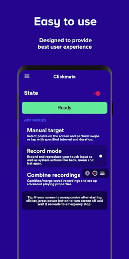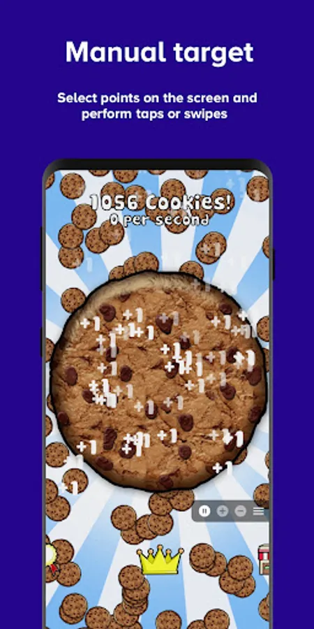 • Manual mode: This is helpful mode for clicking apps and games - select points on the screen, specify action like tap or swipe and do the magic! These action are fully customizable - you can set swipe and tap duration, repeat interval, repeat count and randomize coordinates.