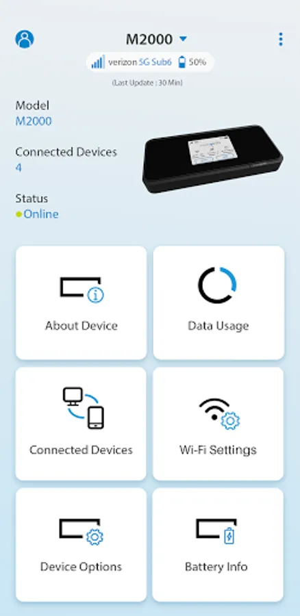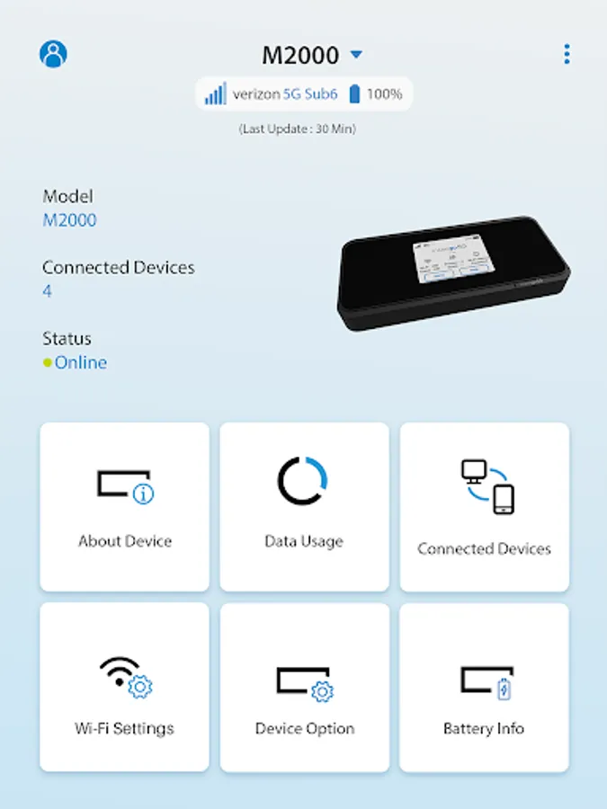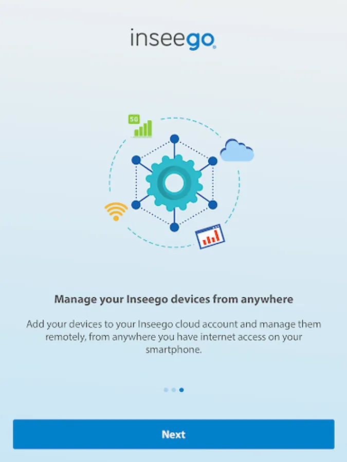 The Mobile App provides cloud-based device management features for all Inseego 5G devices, including FWA devices and mobile devices like the M2000 MiFi hotspot or the Skyus160 IoT gateway. The device management features of the app allow you to configure and manage all your Inseego devices on your smart phone, from anywhere in the world.