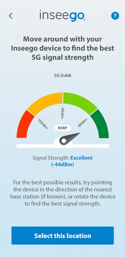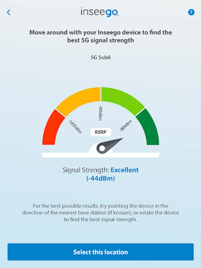 After pairing your smart phone or tablet with your Inseego FWA device, the mobile app automatically collects signal strength data from the device’s 5G cellular connection. As you move the device to different locations and adjust the angle or orientation, the app provides easy-to-understand performance ratings. The app has customized installation flows for end-consumers doing self installation, or for professional installers.