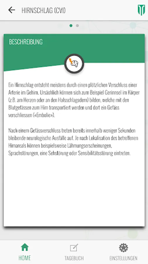 In Switzerland, approximately 16,000 patients suffer a stroke each year (cerebrovascular event). Preventive measures are a big topic and will be covered in detail in this app. Thus, risk factors such as high blood pressure can be minimized through regular exercise, healthy and proper nutrition. Stress reduction is also an important topic.