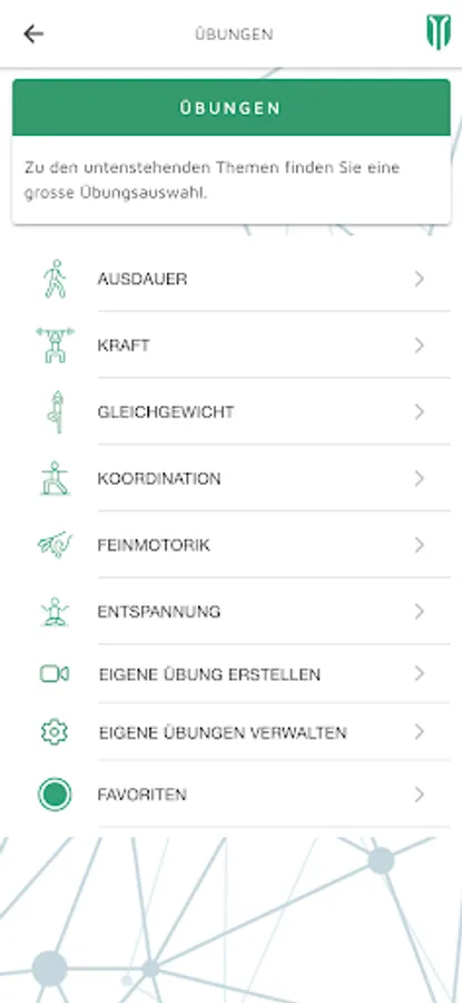 The nervous system can be affected by various diseases or by an accident. In this app you will find the theoretical basics and a catalog of exercises from which you can create your individual program. The program can be supplemented with your own exercises (photos and videos). Furthermore, the current mobility level can be recorded with a video or photo.