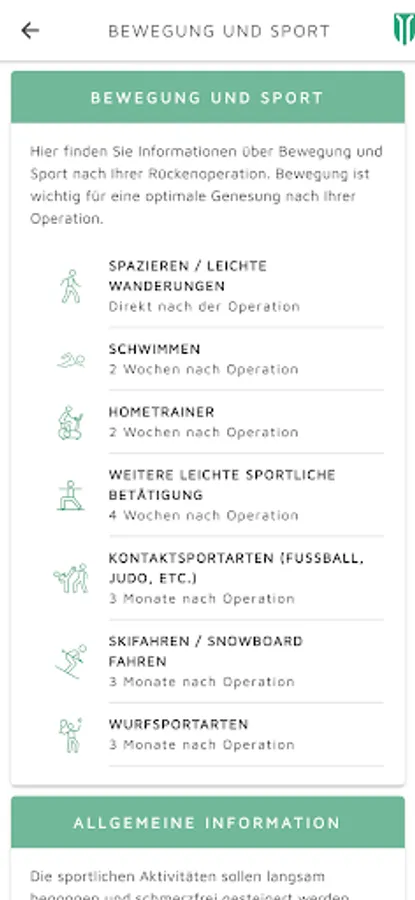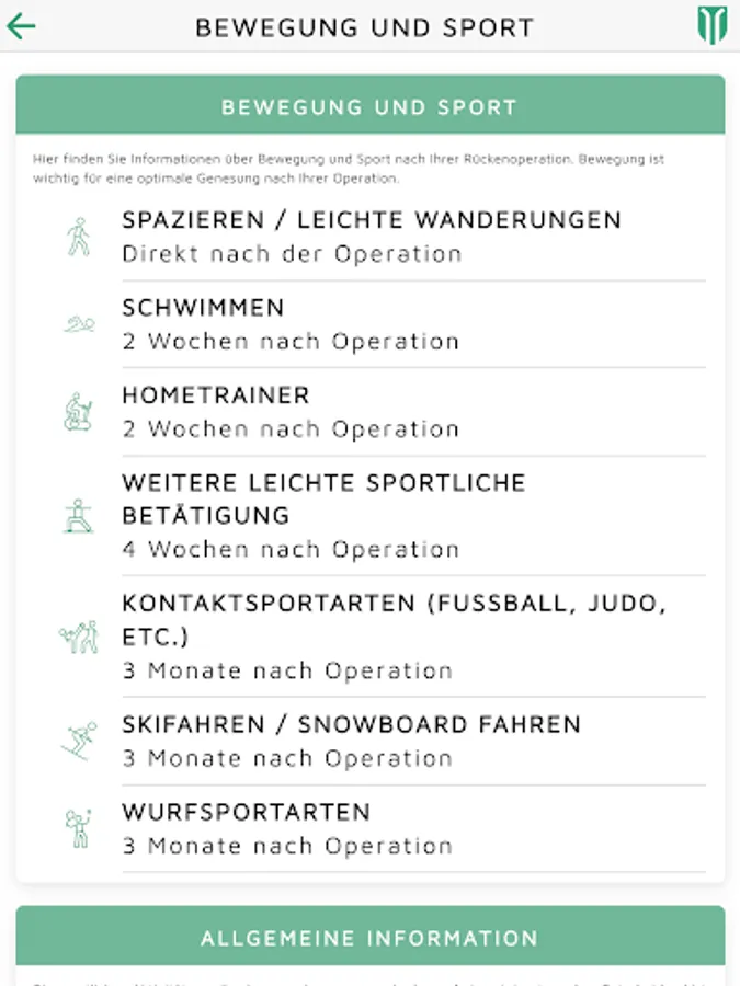 In order to make it easier to get back into everyday life, the app provides you with information on the clinical picture, hospital stay, exercises, everyday activities and exercise and sport.