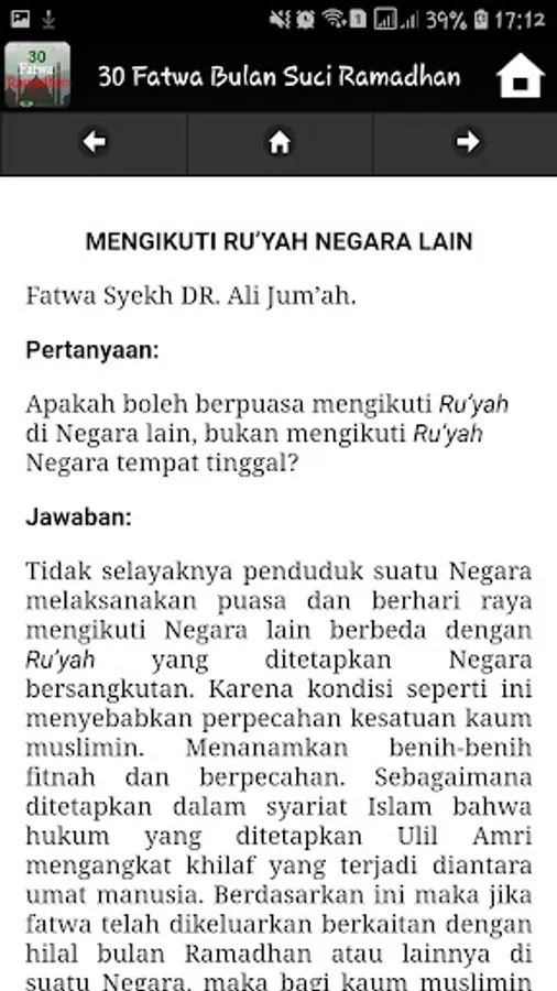 The days change seasons change, but various questions that arise when approaching the month of Ramadan remains the same question, about Hisab and Ru'yah, intentions of fasting, Qadha ', Tarawih, Zakat Fitrah and so forth. Even though these problems have been discussed, humans remain in their limitations, forgetfulness and various activities are still a factor in why the questions keep on repeating, despite the lack of adequate documentation. For this reason, it is deemed necessary to collect various writings relating to the issue of the 30 Ramadhan Fasting Fatwa.