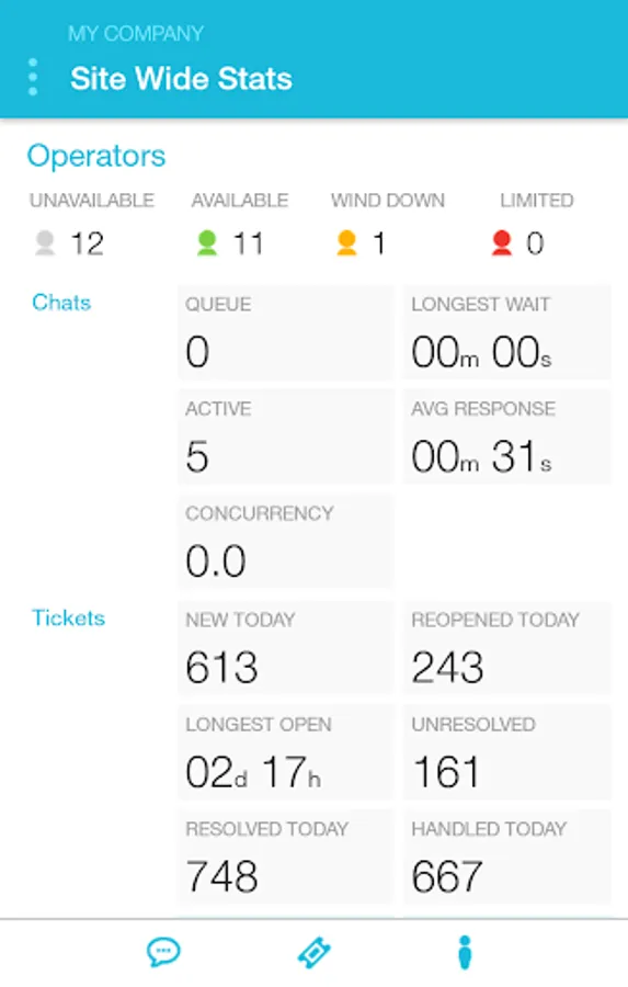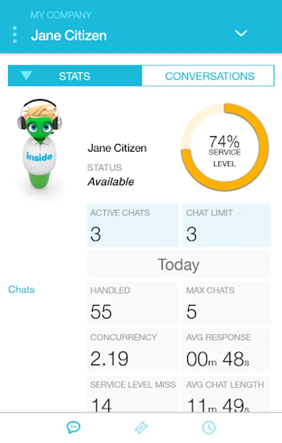 The inside™ manager app allows you to quickly view live updates from your website, including real-time visitors, chats, tickets and messenger chats.