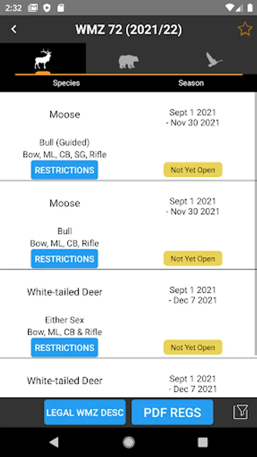 - Select a WMZ to view its summary of big-game, predator and game bird seasons