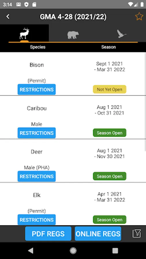 - Select a GMA to view its summary of big-game, predator and game bird seasons (works offline)