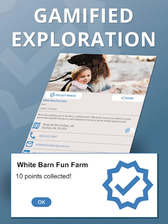 Many locations are assigned a point value, which can be collected when you are within GPS range of a location and have a connection to the internet. Pushing the “Collect Points” button while physically visiting a location will add the location’s points to your point total. To keep earning points, explore more locations. You can track your point total on Your Account page.