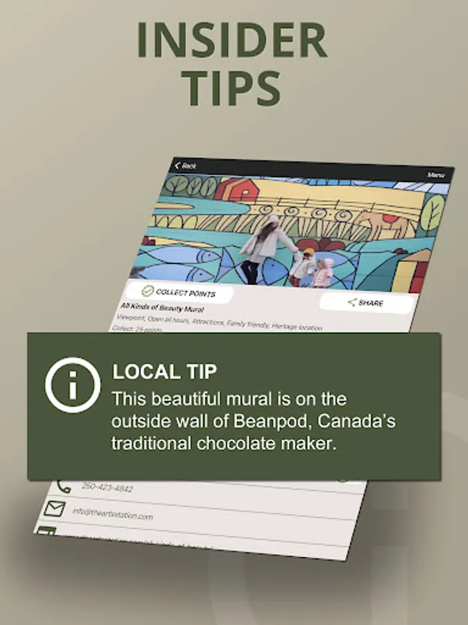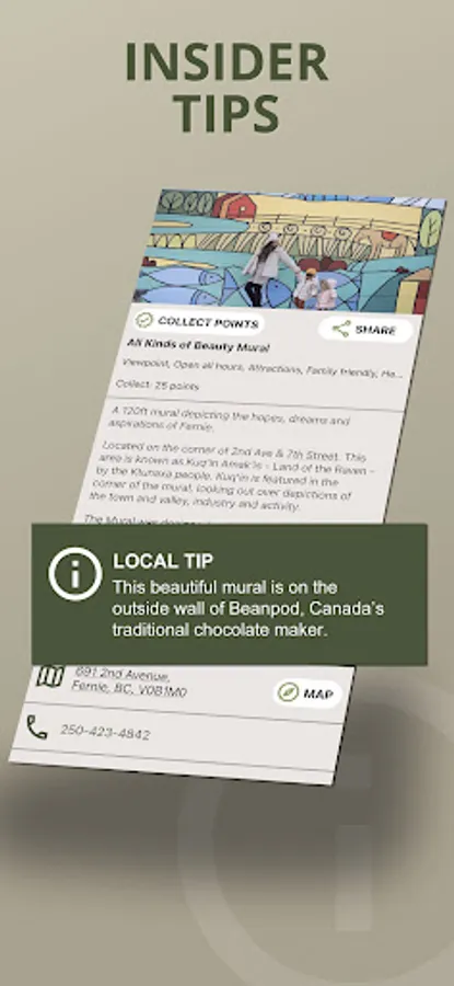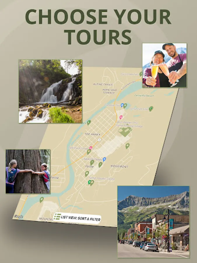 The Explore button takes you to the list of themed self-guided tours, from Best View Spots, Artistic Explorations and Local Heritage to Nature Walks, Family Fun and the unique Taste of Fernie.