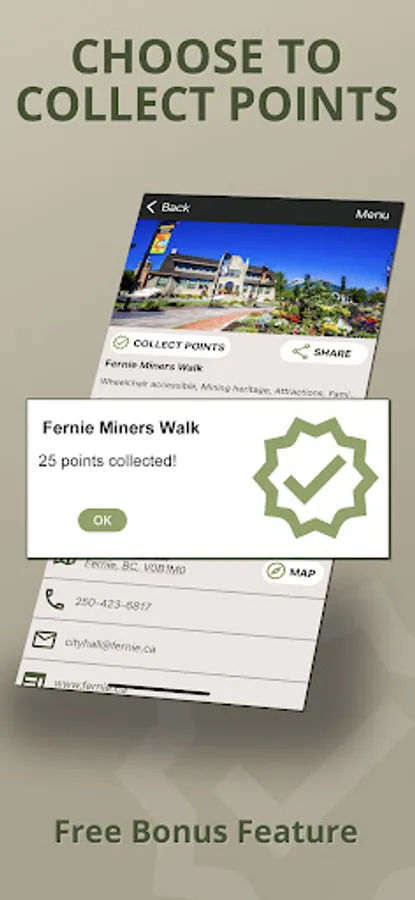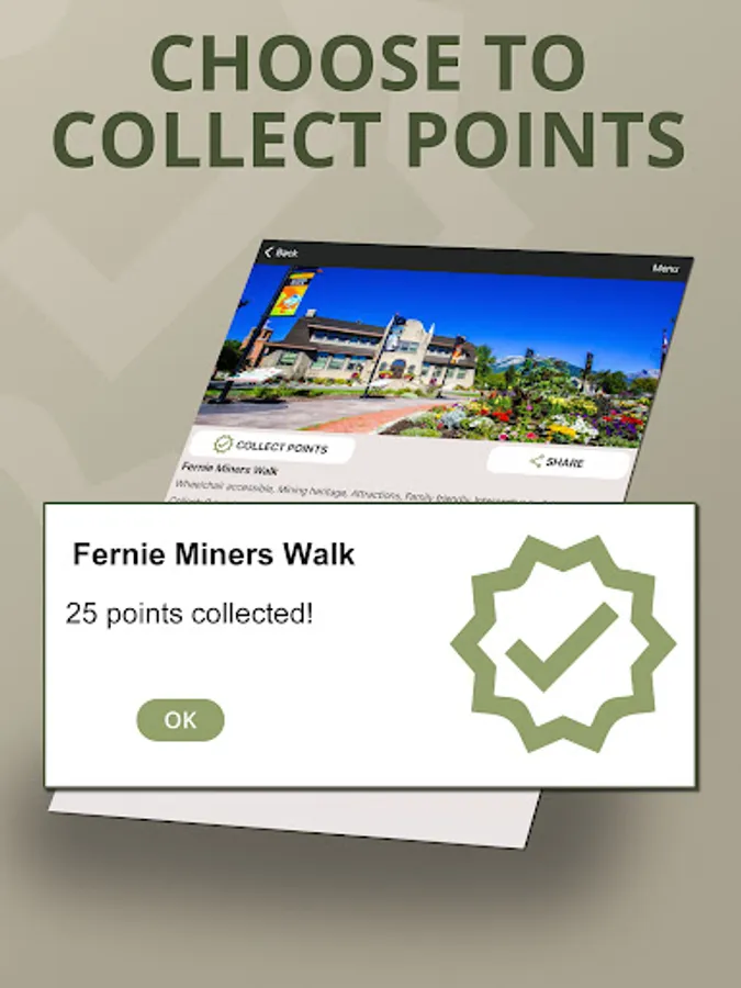 All locations are assigned a point value, which can be collected when you are within GPS range of a location and have a connection to the internet. Pushing the “Collect Points” button while physically visiting a location will add the location’s points to your point total. The more locations you explore, the more points you collect. A free Iconic Fernie account is necessary in order to collect points and redeem rewards. You can track your point total on Your Account page.