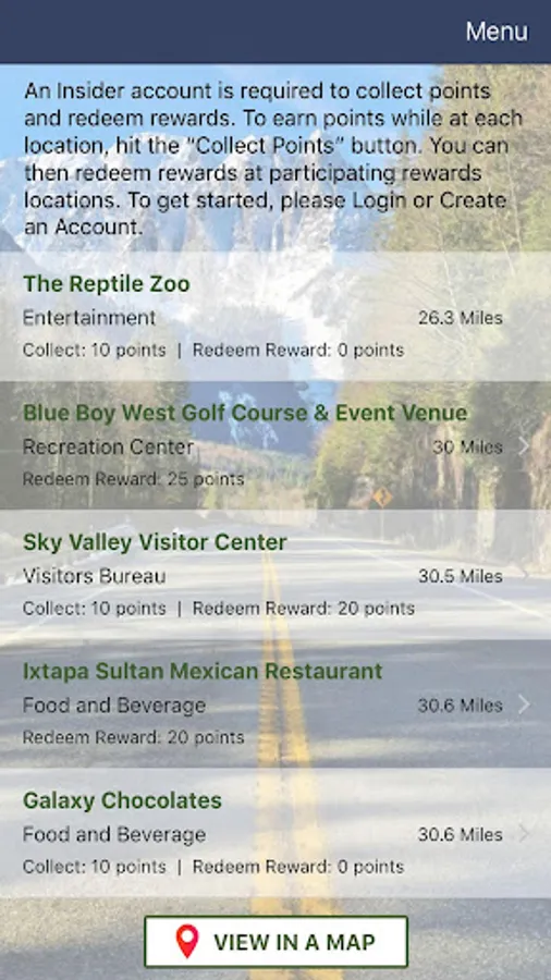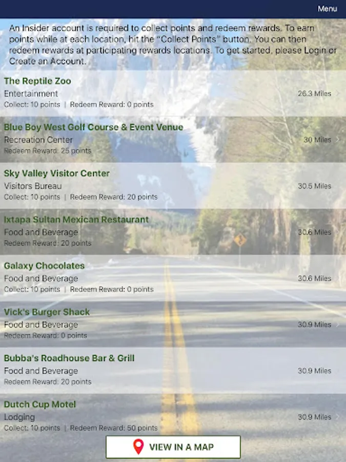 Many locations around Sky Valley are assigned a point value, which can be collected when you are within GPS range of a location and have a connection to the internet. Pushing the “Collect Points” button while physically visiting a location will add the location’s points to your point total. To keep earning points, explore more locations. You can track your point total on Your Account page.