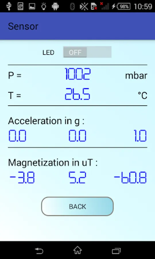 The complete device makes use of Insight SiP ISP130301 BLE module together with low power 3-axis accelerometer and temperature / barometer sensors connected to a primary button cell battery CR2032. The Freescale FXOS8700CQ 3-axis linear accelerometer and 3-axis magnetometer is used to detect acceleration and is combined with ST Micro LPS331AP temperature and barometer sensor.