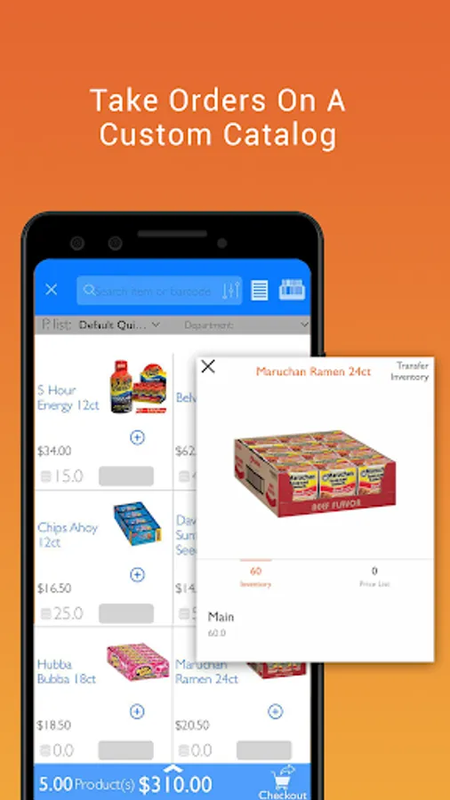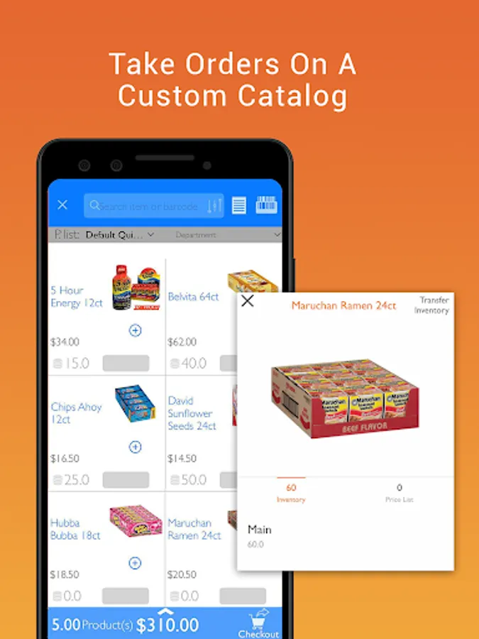 Increase upsell and cross-selling opportunities with the convenience of a digital product catalog with high resolution product images, inventory, pricing, UOM, minimum & case quantity data. Create custom price lists, transfer inventory between warehouses, and generate a PDF catalog for download. Works well at trade shows, warehouses, retail stores - wherever you need to make a sale!