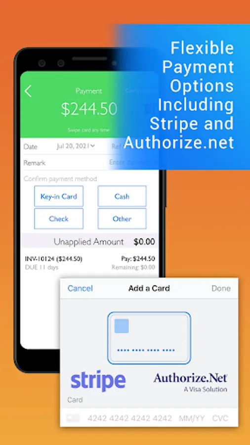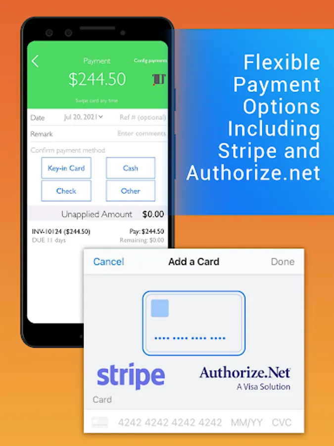 Credit and debit card payments can be securely recorded with the app. Our mobile payment system enables acceptance with manual entry, a card reader, barcode scanner or a bluetooth scanner.