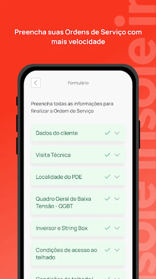 It is possible to fill out forms such as: Technical Inspection, Implementation, Maintenance and Occupational Health and Safety.