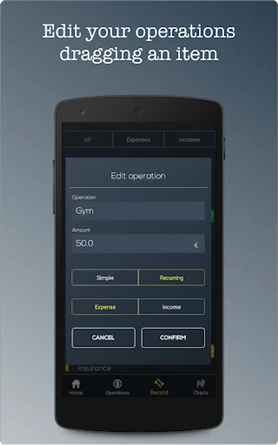 This page offers an overview about logged movements. So, when you add your incomes or expenses you will be able to see a list of all of them. You can filter by all, expenses or incomes. There is an option to delete or edit an operation. Just drag it and options will appear. That useful functions will save your time.